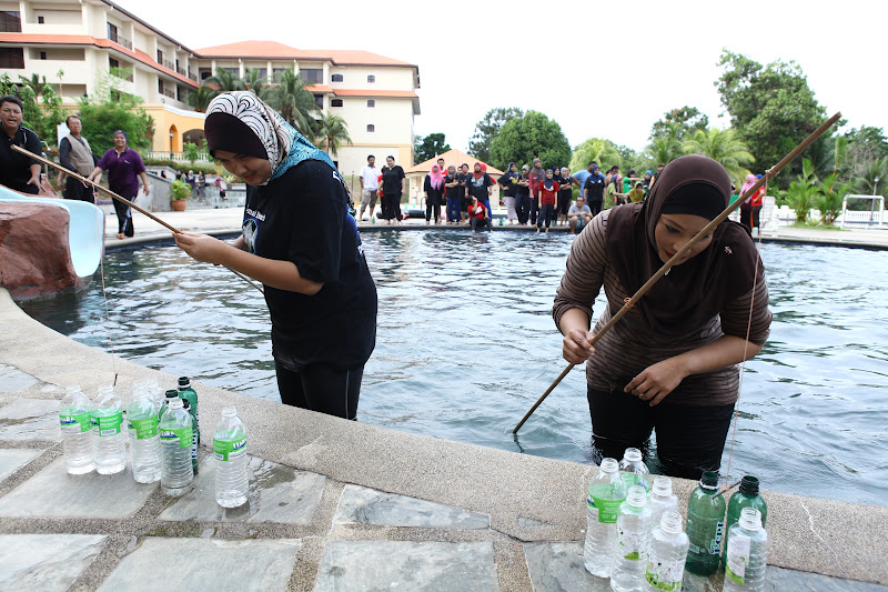 Aktiviti petang pada hari pertama ialah aktiviti air di swimming pool. Macam-macam aktiviti ada seperti isi air dalam botol menggunakan tangan...korang mampu? Sesapa yang tapak tangan besar....memanglah boleh tadah air banyak. Aku ni badan besau tapi tangan kecil...terkial2 aku nak tadah air isi dalam botol. Air yg melimpah kuar lebih banyak daripada yg masuk botol hahaha. Jom tengok gambar-gambar aku tu. Gambar aku terselit-selit ajer dalam ramai-ramai tu.