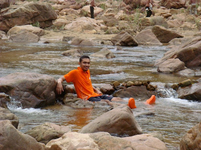 Kami melalui sungai ini mengikut lawan arus air sungai mengalir. So, apabila melalui jeram yang begitu deras air berombak, kami menjerit terkejut habis baju basah. Hehehe...jakun betul. Because i duduk depan sekali...so baju belum begitu basah. Orang belakang dah habis kuyup. Akhirnya setelah melalui beberapa jeram, my baju habis lencun satu badan. Ku tewas akhirnya.